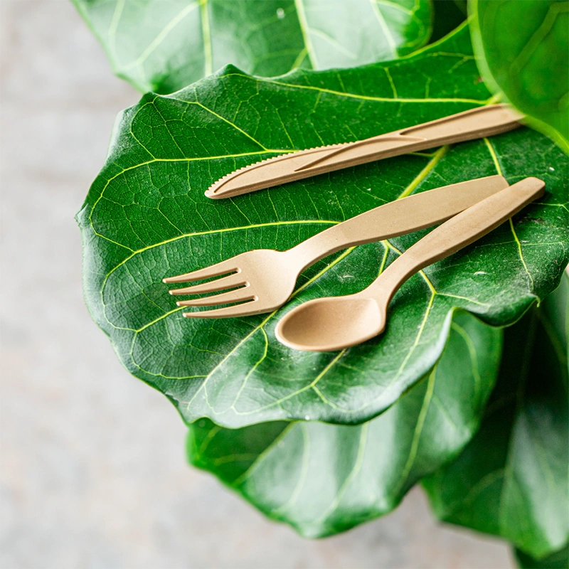 Tous nos ustensiles de table biosourcés sont issus de la biomasse, principalement de la canne à sucre. La bagasse, un résidu naturel, est transformée en une matière compostable performante et résistante.