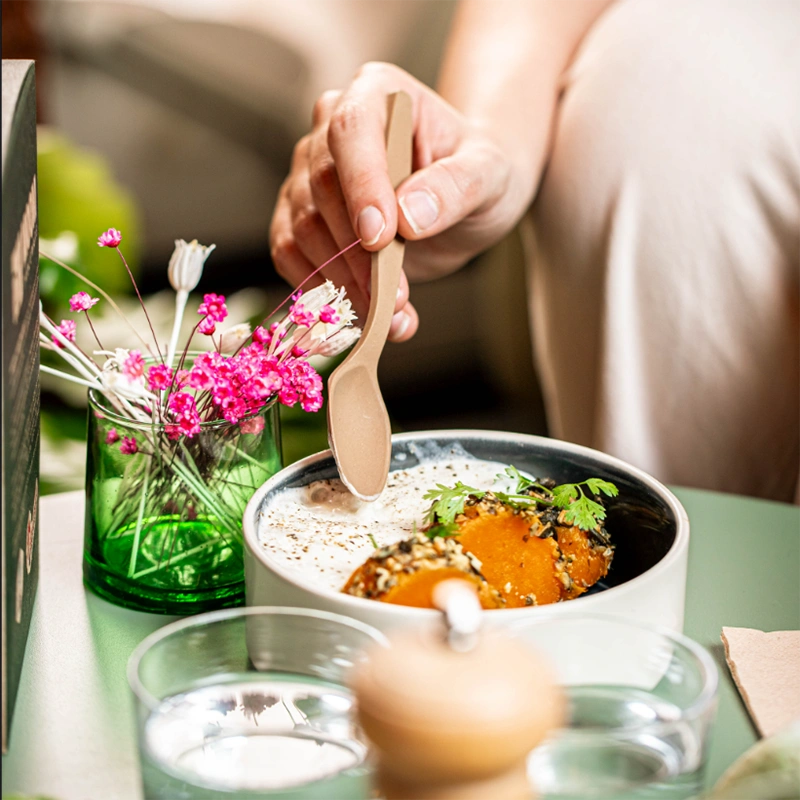 Idéales pour vos soupes et vos desserts ! Boite de 200 cuillères de 16 cm, biosourcées, réutilisables 100x, et Made in France. Lisse et agréable en bouche. Ne fond pas dans vos plats !