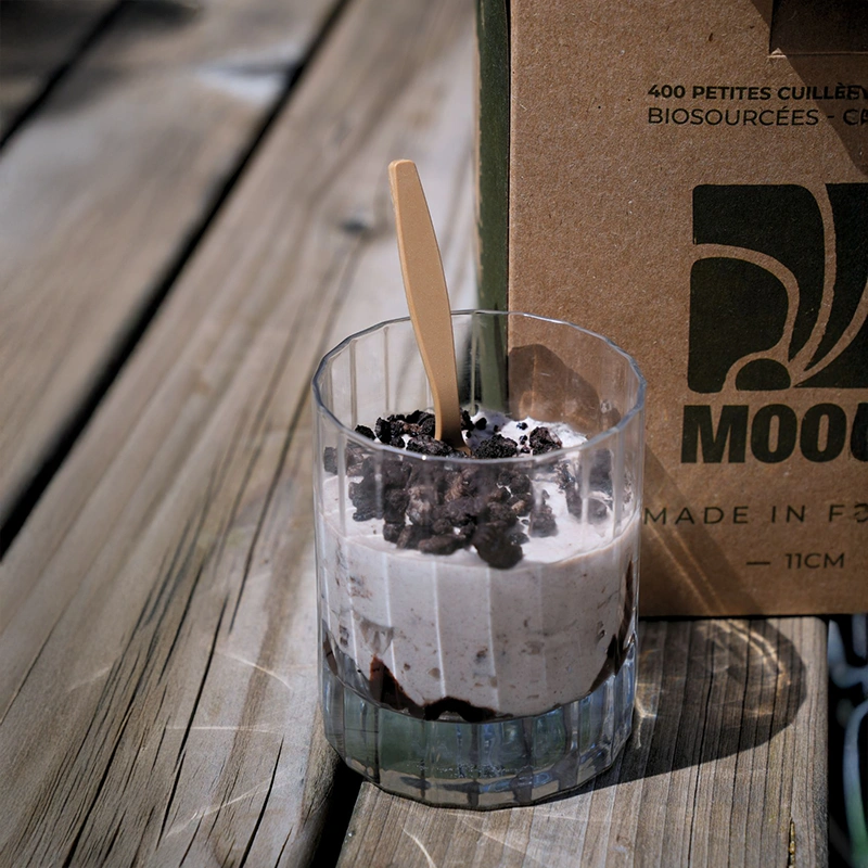 Idéales pour vos verrines et petits desserts ! Boite de 400 cuillères de 11 cm, biosourcées, réutilisables 100x, et Made in France. Lisse et agréable en bouche. Ne fond pas dans vos plats !